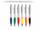 Reklamepenn med sølv/metallfarget pennekropp og fem forskjellige farger på gummigrep. Rimelig reklamepenn med gode skriveegenskaper. Minsteantall 500 stk.
